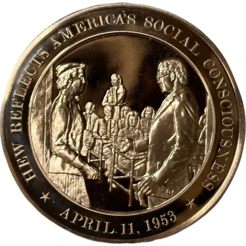 | Obverse lettering | HEW REFECTS AMERICA`S SOCIAL CONSCIOUSNESS GC APRIL 11, 1953 |
