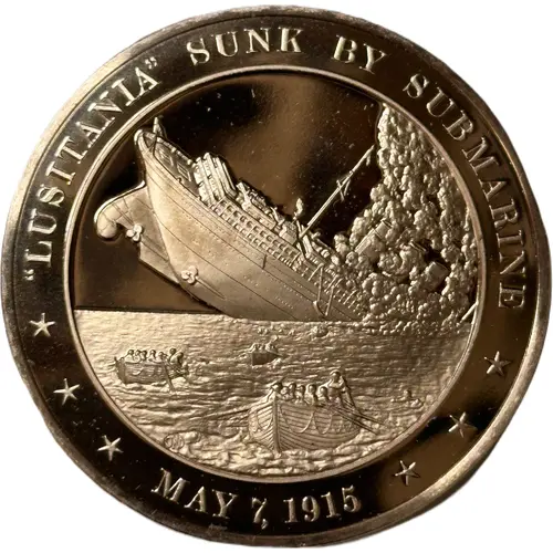 | Надписи аверса | `LUSITANIA` SUNK BY SUBMARINE JHD MAY 7, 1915 |