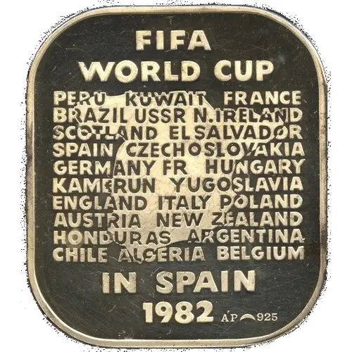 | Légende de l’avers | HUNGARIAN FOOTBALL FEDERATION FIFA WORLD CUP PERU KUWAIT FRANCE BRAZIL USSR N.IRELAND SCOTLAND EL SALVADOR SPAIN CZECHOSLOVAKIA GERMANY FR HUNGARY KAMERUN YUGOSLAVIA ENGLAND ITALY POLAND AUSTRIA NEW ZEALAND HONDURAS ARGENTINA CHILE ALGERIA BELGIUM IN SPAIN 1982 AP 925 |