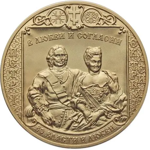 | Obverse lettering | В ЛЮБВИ И СОГЛАСИИ ПЕТР I ЕКАТЕРИНА I ВО ВЛАСТИ И ЛЮБВИ (Translation: In love and harmony Peter I Catherine I In power and love) |