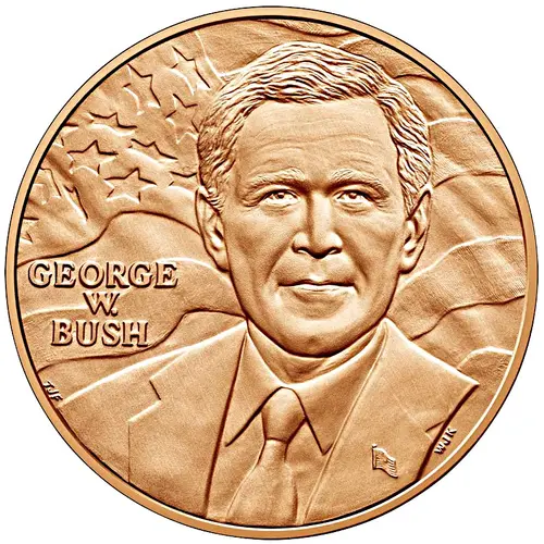 The obverse of the medal features a portrait of George W. Bush with the inscription “GEORGE W. BUSH” centered along the left of the medal with the American flag in the background. |