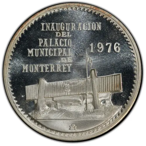 | Obverse description | Front facade of the city hall of Monterrey mintmark below. |