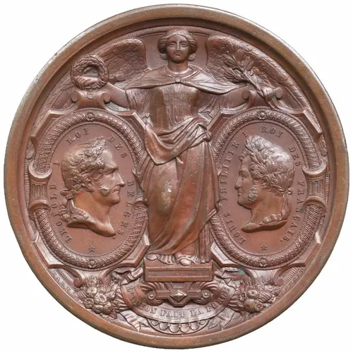 | Obverse description | Winged goddess of victory with laurel wreath and olive branch connects two medallions. Left: Leopold I, King of the Belgians (to the right); right: Louis-Philippe I, King of the French (to the left). Inscriptions: ‘LEOPOLD I ROI DES BELGES’ and ‘LOUIS PHILIPPE ROI DES FRANÇAIS’. Below: ‘L`UNION FAIT LA FORCE’. |