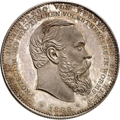 | Obverse lettering | LUDWIG IV GROSSHERZOG VON HESSEN UND BEI RHEIN PROTECTOR DES STÄDTOSCHEN VOLKSTHEATERS IN WORMS A/RH. ✶ 1889 ✶ |