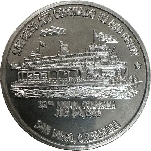| 表面の銘文 | SAN DIEGO AND CORONADO ISLAND FERRY MJV 32ND ANNUAL COINARAMA JULY 8-9, 1989 SAN DIEGO, CALIFORNIA |