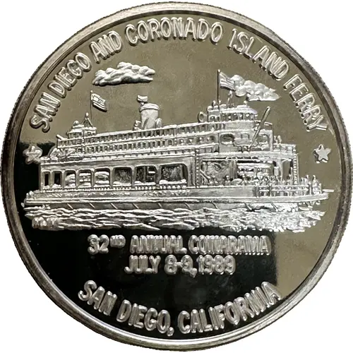 | Obverse lettering | SAN DIEGO AND CORONADO ISLAND FERRY MJV 32ND ANNUAL COINARAMA JULY 8-9, 1989 SAN DIEGO, CALIFORNIA |