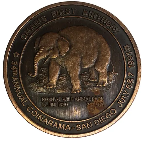 | Obverse lettering | OMAR`S FIRST BIRTHDAY BORN AT WILD ANIMAL PARK 13 JUNE 1990 267 LBS. * 34TH ANNUAL COINARAMA - SAN DIEGO JULY 6&7 1991 * |