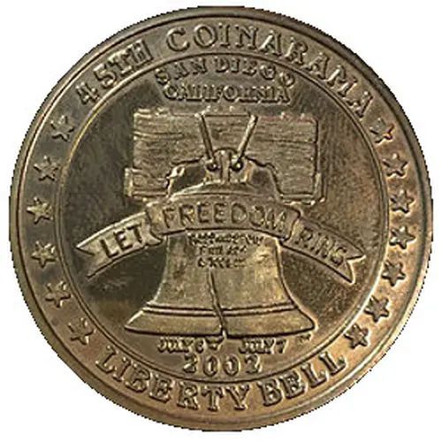 | Obverse lettering | 45TH COINARAMA SAN DIEGO CALIFORNIA LET FREEDOM RING PASS AND STOW PHILADA LCCLIII JULY 6 JULY 7 2002 LIBERTY BELL |