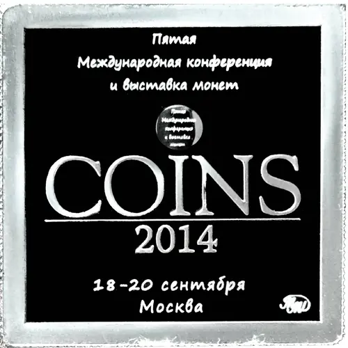| Obverse lettering | ПЯТАЯ МЕЖДУНАРОДНАЯ КОНФЕРЕНЦИЯ И ВЫСТАВКА МОНЕТ COINS 2014 18-20 СЕНТЯБРЯ МОСКВА ММД (Translation: FIFTH INTERNATIONAL CONFERENCE AND EXHIBITION OF COINS COINS 2014 18-20 SEPTEMBER MOSCOW MMD) |