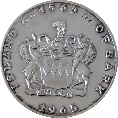 | Reverse description | Coat of Arms of Sibyl Hathaway, the Dame of Sark at the time. Dates and legend around. |