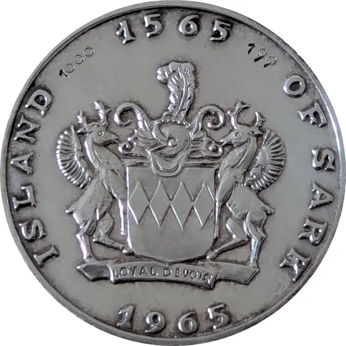 | Reverse description | Coat of Arms of Sibyl Hathaway, the Dame of Sark at the time. Dates and legend around. |