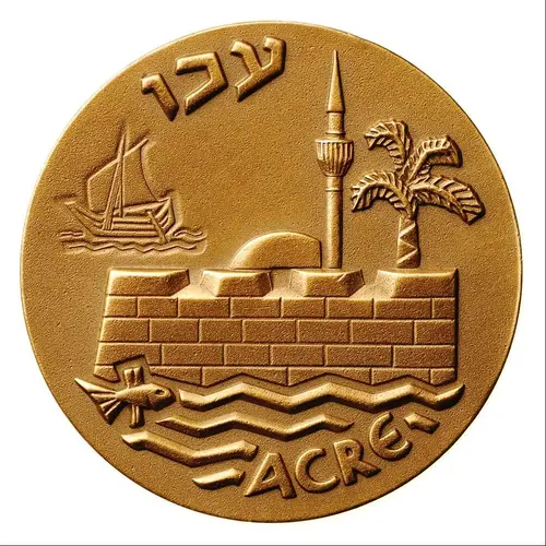 In the center a replica of an Acre coin minted by the Emperor Elagabalus at the beginning of the third century C.E. Beneath, a spiral line showing the sea waves, mooring arches showing above. which served to shelter ships in the harbor. Above, on top of the central hill within the city, another shrine. Around the rim an inscription `Coin of Acre 3977-82` in Hebrew and in English, the date being 217-222 C.E. |