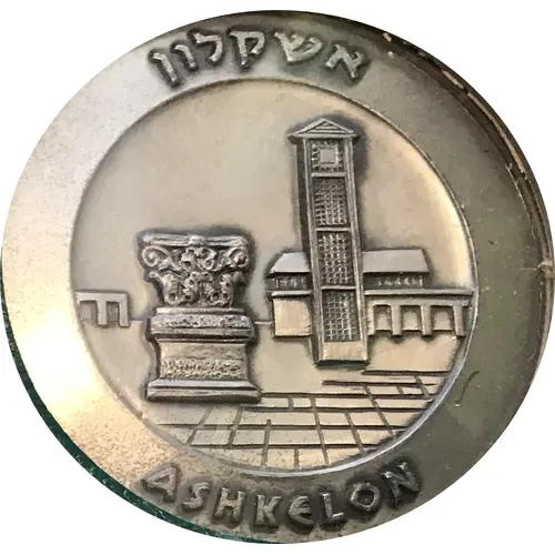 | Reverse description | In the center a replica of an antique bronze Ashkelon coin. It shows the prow of a vessel and oars. Above the model of the vessel, Greek letter abbreviating the word Ashkelon. Below, letters marking the year 57 according to the city`s new date (47 B.C.E.) On the medal rim, above, the inscription: `Ashkelon coin 47 B.C.E.`, 3713 in Hebrew. |