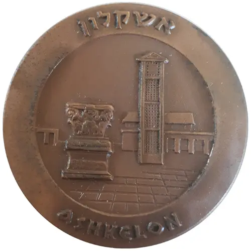 | Reverse description | In the center a replica of an antique bronze Ashkelon coin. It shows the prow of a vessel and oars. Above the model of the vessel, Greek letter abbreviating the word Ashkelon. Below, letters marking the year 57 according to the city`s new date (47 B.C.E.) On the medal rim, above, the inscription: `Ashkelon coin 47 B.C.E.`, 3713 in Hebrew. |
