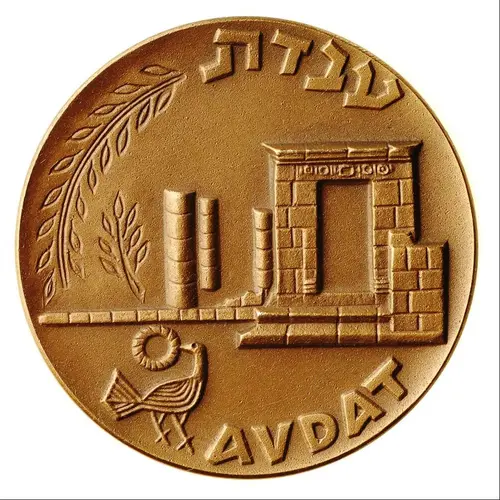 In the center, the arch which served as entrance to the Acropolis during all of the historical periods. To the left, columns of different sizes. The field is decorated with an engraved motif of leaves and branches on a Nabatean bowl from Avdat (1 st century CE). Below, to the left, a replica of a stone relief motif of the late Roman period, representing a bird. The name of the city, `Avdat` in Hebrew above and in English below. |