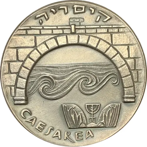 | Obverse description | A stylized impression of the city: a Roman arch with the sea beyond. Below, a capital from the 5th century synagogue found on the spot, featuring a seven-branched candelabrum between acanthus leaves. The name of the city, `Caesarea`, in Hebrew above and in English below. |