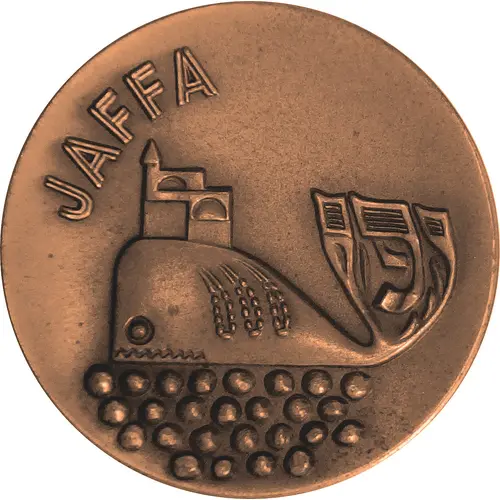 | Obverse description | The promontory of Jaffa in the form of Jonah`s whale, carrying old-fashioned dwellings on its back. This tail is shaped into three Hebrew letters (Yafo). The name of the city, `Jaffa`, in Hebrew above and in English below. |