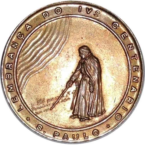 | Obverse description | Embossed edge. Contouring the edge, the inscriptions: LEMBRANÇA DO IVº CENTENARIO (above); * S. PAULO * (below). In the center, outlined by a continuous ring, the figure of Father José de Anchieta writing poems on the beach using a stick. |