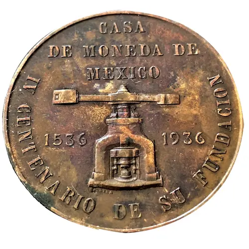 | Obverse lettering | CASA DE MONEDA DE MEXICO 1536 - 1936 IV CENTENARIO DE SU FUNDACION (Translation: MEXICO COIN HOUSE 1536 - 1936 IV CENTENARY OF ITS FOUNDATION) |