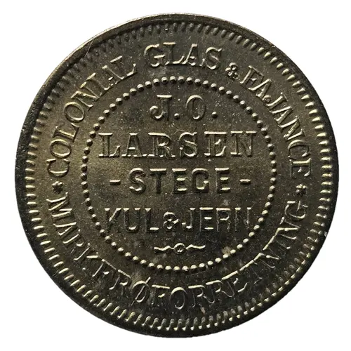 Obverse lettering COLONIAL GLAS & FAJANCE J.O. LARSEN STEGE KUL & JERN MARKFRØ FORRETNING
