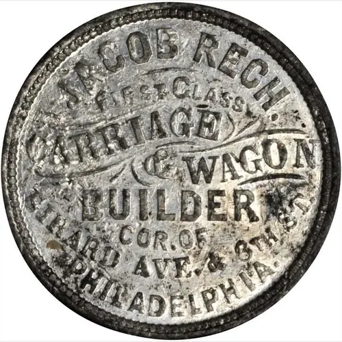 | Obverse lettering | JACOB RECH. FIRST CLASS CARRAIGE & WAGON BUILDER COR. OF GIRARD AVE. & 8TH ST. PHILADELPHIA |