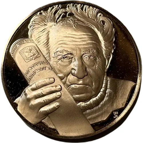 | Reverse lettering | BEN-GURION LED STRUGGLE FOR JEWISH INDEPENDENCE IN PALESTINE. FIRST PRIME MINISTER AND DEFENSE MINISTER OF ISRAEL. HEADED LABOR MOVEMENT RENAISSANCE. 1886-1973 FM |