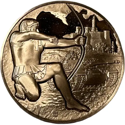 | Reverse lettering | SIX-DAY WAR JUNE 5-JUNE 10, 1967 ISRAEL BROKE FREE FROM CLOSING RING OF FOES. `OUR WARRIORS PREVAILED NOT BY THEIR WEAPONS BUT BY THEIR SENSE OF MISSION.` FM |
