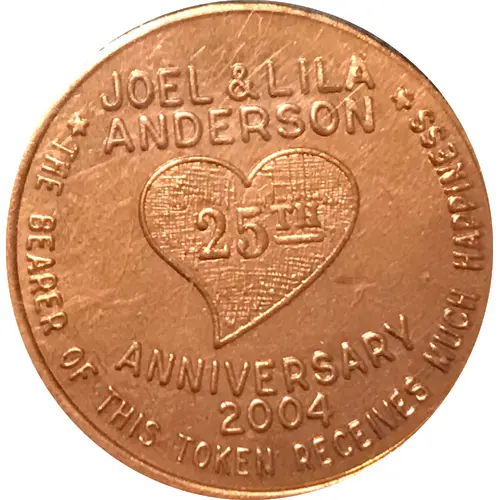 | Obverse lettering | JOEL AND LILA ANDERSON 25 ANNIVERSARY 2004 THE BEARER OF THIS TOKEN RECEIVES MUCH HAPPINESS |