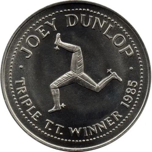 | Obverse lettering | JOEY DUNLOP TRIPLE T.T. WINNER 1985 |