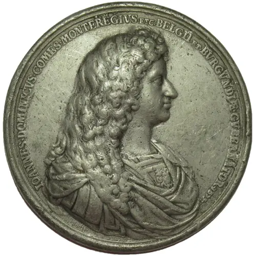 IOANNES DOMINICVS COMES MONTEREGIVS ETC: BELGII ET BVRGVNDIÆ GVBERNATOR 1675 (Translation: John Dominic, Count of Monterey etc, Governor of Belgium and Burgundy.) |