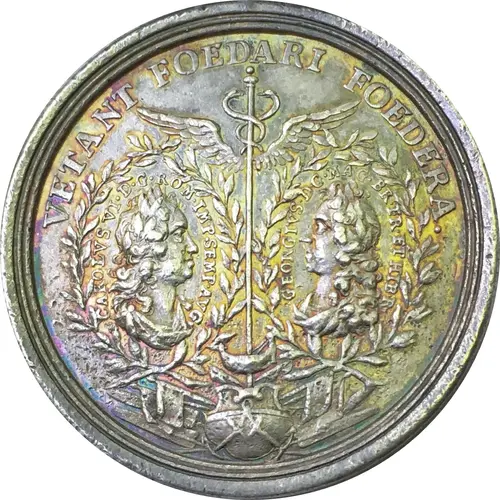 Obverse description Two conjoined busts of Karl VI and George I within laurel wreath`s facing each other, at the center a caduceus over arms and a breastplate.