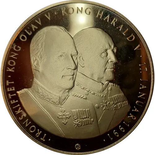 | Obverse lettering | · TRONSKIFTET · KONG OLAV V · KONG HARALD V · 17. JANUAR 1991 · IAR |
