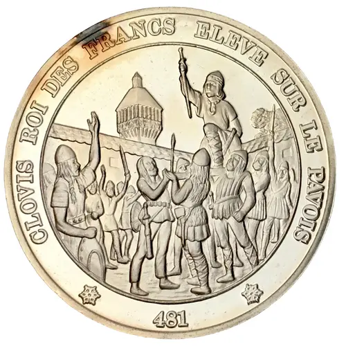 | Obverse description | On the death of his father, Childeric I, Clovis was raised by his soldiers, as was the Frankish custom. |