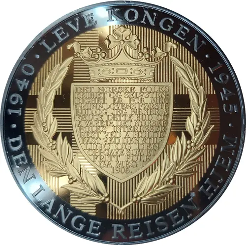 | Leyenda del anverso | 1940 · LEVE KONGEN · 1945 DET NORSKE FOLKS FRIHET OG SELVSTEN- DIGHET ER FOR MEG GRUNNLOVENS FØRSTE BUD, OG JEG MENER Å FØLGE DETTE BUD OG Å VARETA DET NORSKE FOLKS INTERESSER BEST VED Å HOLDE FAST VED DEN STIL- LING OG DEN OPPGAVE SOM ET FRITT FOLK GA MEG I 1905. · DEN LANGE REISEN HJEM · (Translation: The freedom and independence of the Norwegian people is to me the first commandment of the constitution, and I mean to follow this commandment and to best protect the Norwegian people by holding the position and tasks that the free people gave me in 1905. The long journey home.) |