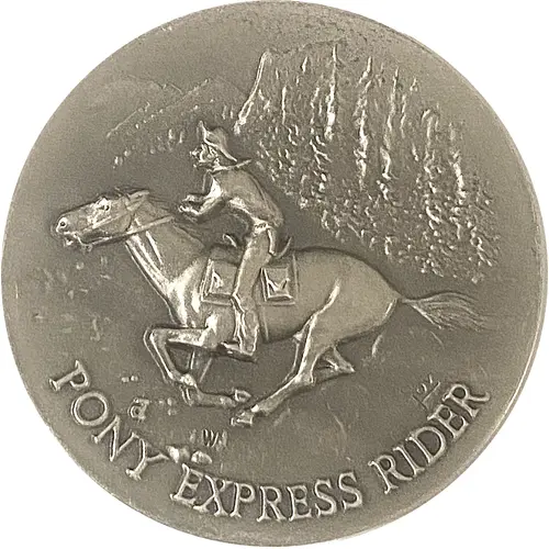 Image of a Pony express rider, riding hard with a pistol pon his side. Legend on bottom perimeter. Mint mark Below the horse. Designer`s mark above the n in pony. Addition marks crossed lines with letters o ov above er in rider. |