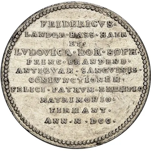 | Obverse lettering | FRIDERICVS LANDGRHASSHAER ET LVDOVICADORSOPH PRINCBRANDENB ANTIQVAMSANGVINIS CONIVNCTIONEM FELICIPATRVMEXEMPLO MATRIMONIO FIRMANT ANN M DCC |