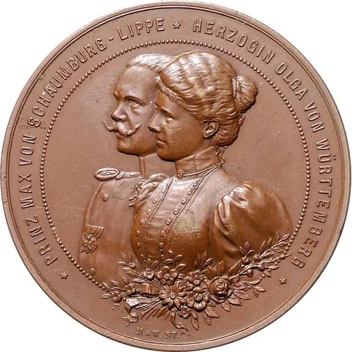 | Obverse lettering | PRINZ MAX VON SCHAUMBURG - LIPPE HERZOGIN OLGA VON WÜRTTEMBERG M. & W. ST. |