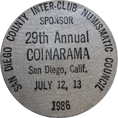 | Obverse lettering | SAN DIEGO COUNTY INTER-CLUB NUMISMATIC COUNCIL SPONSOR 29th Annual COINARAMA San Diego, Calif. JULY 12, 13 1986 |