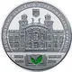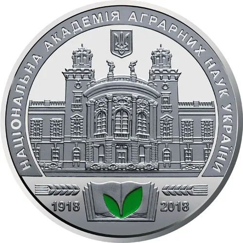 There is Ukraine’s small coat of arms; in the middle is an historic building erected in the early 20th century that houses the academy; above is the circular legend НАЦІОНАЛЬНА АКАДЕМІЯ АГРАРНИХ НАУК УКРАЇНИ (National Academy of Agrarian Sciences of Ukraine); underneath is a book with two enameled green leaves, on either side of which are ears of wheat and the years 1918 and 2018. |