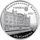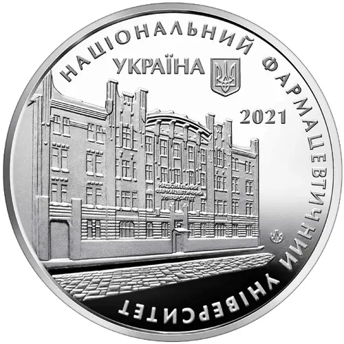 On top is the legend УКРАЇНА (Ukraine) and Ukraine’s small coat of arms, below is the medal’s issue year 2021; the image of the University’s building (to the left against the smooth background); the circular legends reading: НАЦІОНАЛЬНИЙ ФАРМАЦЕВТИЧНИЙ УНІВЕРСИТЕТ (National University of Pharmacy); the mint mark of the NBU’s Banknote Printing and Minting Works (to the right of the building). |