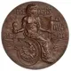 Genius of Industry represented as a veiled woman seated on a winged chariot (but looks like a wheelchair). She holds in her outstretched forearms a statue of a Victory in her left and a light bulb in the right. |