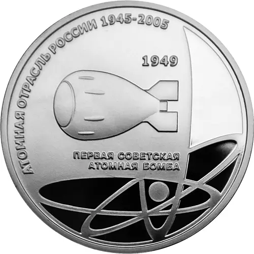 | Obverse lettering | АТОМНАЯ ОТРАСЛЬ РОССИИ 1945-2005 1949 ПЕРВАЯ СОВЕТСКАЯ АТОМНАЯ БОМБА (Translation: NUCLEAR INDUSTRY OF RUSSIA 1945-2005 1949 FIRST SOVIET ATOMIC BOMB) |