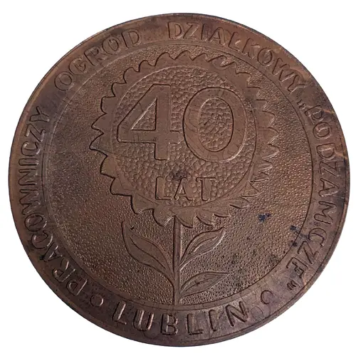 | Obverse lettering | PRACOWNICZY OGRÓD DZIAŁKOWY `PODZAMCZE` LUBLIN 40 LAT (Translation: EMPLOYEE ALLOCATION GARDEN `PODZAMCZE` LUBLIN 40 YEARS) |