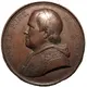 Saint Peter seated on the right with the keys, receiving the gifts presented to him by two figures, one standing and the other kneeling. Legend around and in the exergue with the date in Roman numerals. |