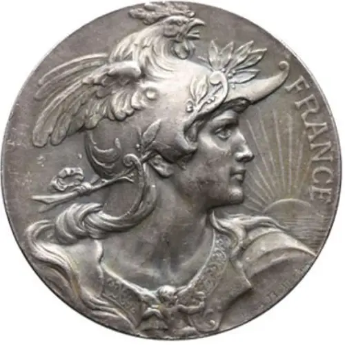 | Obverse description | Bust of the Republic on the right, with winged helmet in the shape of a rooster, draped and cuirassed; rising sun in the background. |