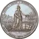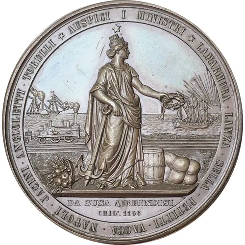 Allegorical figure of Italy standing turned right, wearing a turret hat with a star above, holding in the left hand a laurel wreath, at bottom various goods, on the sea background with sailing and steam ships and a train. |