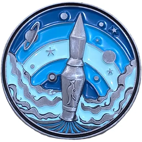 A space-themed design with a metallic rocket soaring through a stylised cosmic background. |