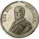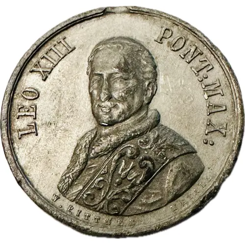 Bust of Pope Leo XIII (Vincenzo Gioacchino Raffaele Luigi Pecci), facing left with head slightly right, attired in ornate pontifical vestments. Intricately rendered cope with detailed foliate embroidery. Legend around periphery. Signed in exergue. |