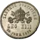 The Papal tiara (triregnum) above the crossed Keys of Saint Peter—one gold and one silver—emblems of spiritual and temporal authority, encircled by the legend. The bottom commemorating the date of the new pope’s election following the death of Pius IX. |