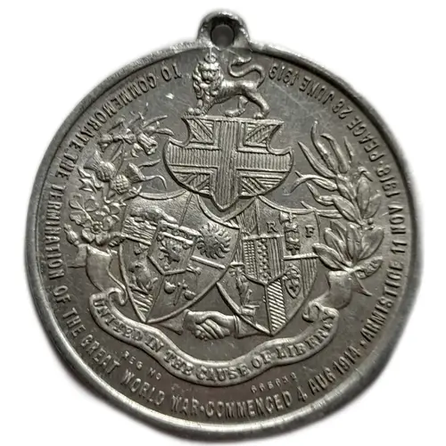 TO COMMEMORATE THE TERMINATION OF THE GREAT WORLD WAR COMMENCED 4 AUG 1914 ARMISTICE 11 NOV 1918 PEACE 28 JUNE 1919 UNITED IN THE CAUSE OF LIBERTY REG NO 665632 |